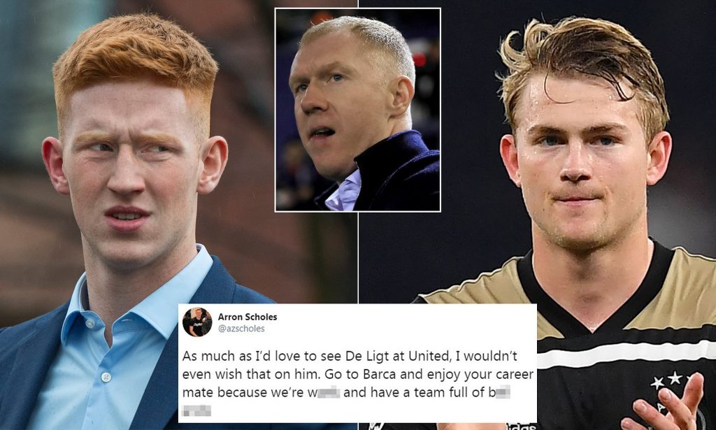 อาร์รอน สโคลส์ ลูกชายหัวแก้วหัวแหวนของ พอล สโคลส์ อดีตนักเตะของแมนเชสเตอร์ ยูไนเต็ด แนะนำ มัธไทจ์ เดอ ลิกต์ ปราการหลังดาวรุ่งของอาแจ็กซ์ ให้ย้ายไปบาร์เซโลน่าแทนทีมปีศาจแดง หากต้องการประสบความสำเร็จในอาชีพค้าแข้งผ่าน ทวิตเตอร์ สื่อโซเชียลระดับโลก