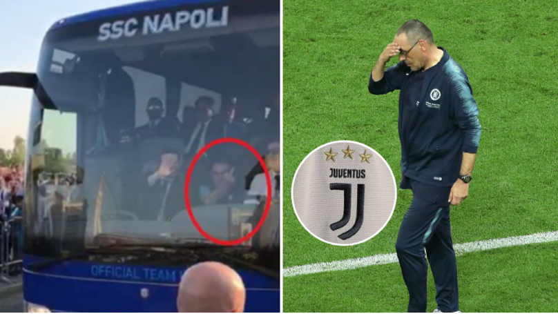 +++ #Sarri shows middle finger to #Juve fans as #Napoli team bus arrive at the Allianz Stadium +++#JuveNapoli
