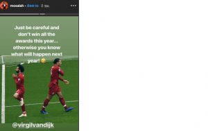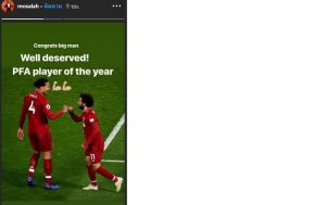 ซาลาห์ ลงสตอรี่อินตราเเกรมส่วนตัว รูปเเรกเป็นข้อความเเสดงความยินดี “ยินดีกับลูกพี่ คว้ารางวัล PFA!!” ส่วนรูปที่ 2 เจ้าตัวออกโรงเตือน ฟาน ไดจ์ค “ระวังตัวด้วย! อย่าได้รางวัลนี้ทุกปี เพราะไม่รู้ว่าปีหน้าจะเกิดอะไรขึ้น(หัวเราะ)”