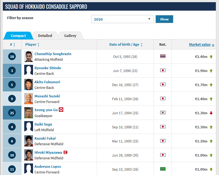 ขณะที่อันดับ 2 คือ เรียวซูเกะ ชินโดะ กองหลังชาวญี่ปุ่น วัย 23 ปี ที่มีค่าตัว 1.9 ล้านยูโร และอันดับ 3 อากิโตะ ฟูกูโมริ ซึ่งมีค่าตัว 1.7 ล้านยูโร