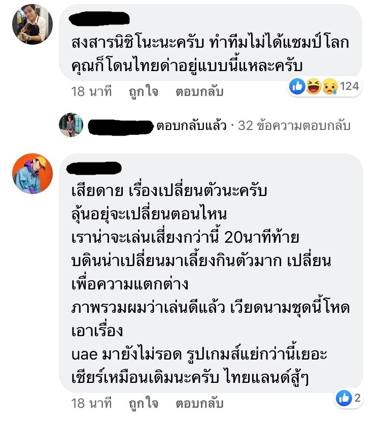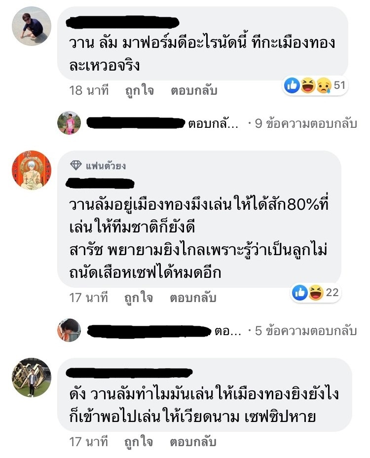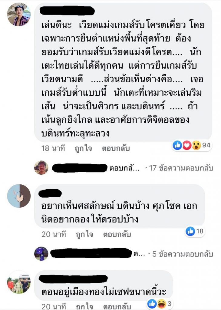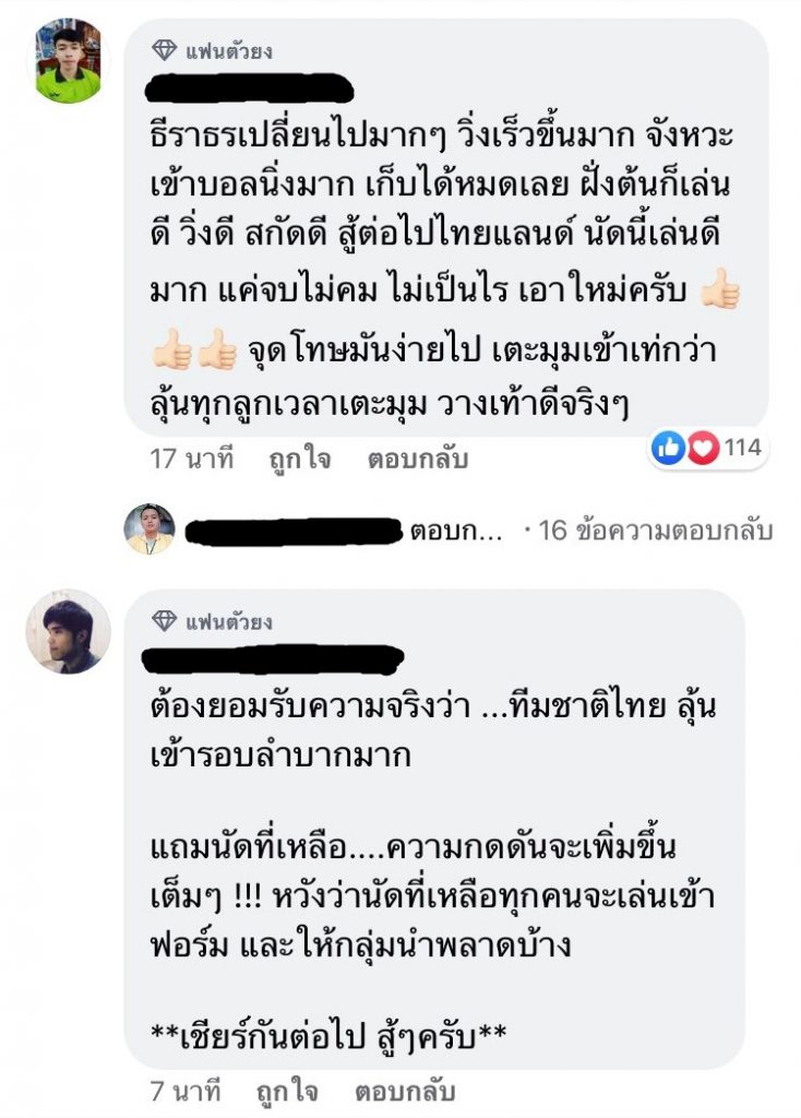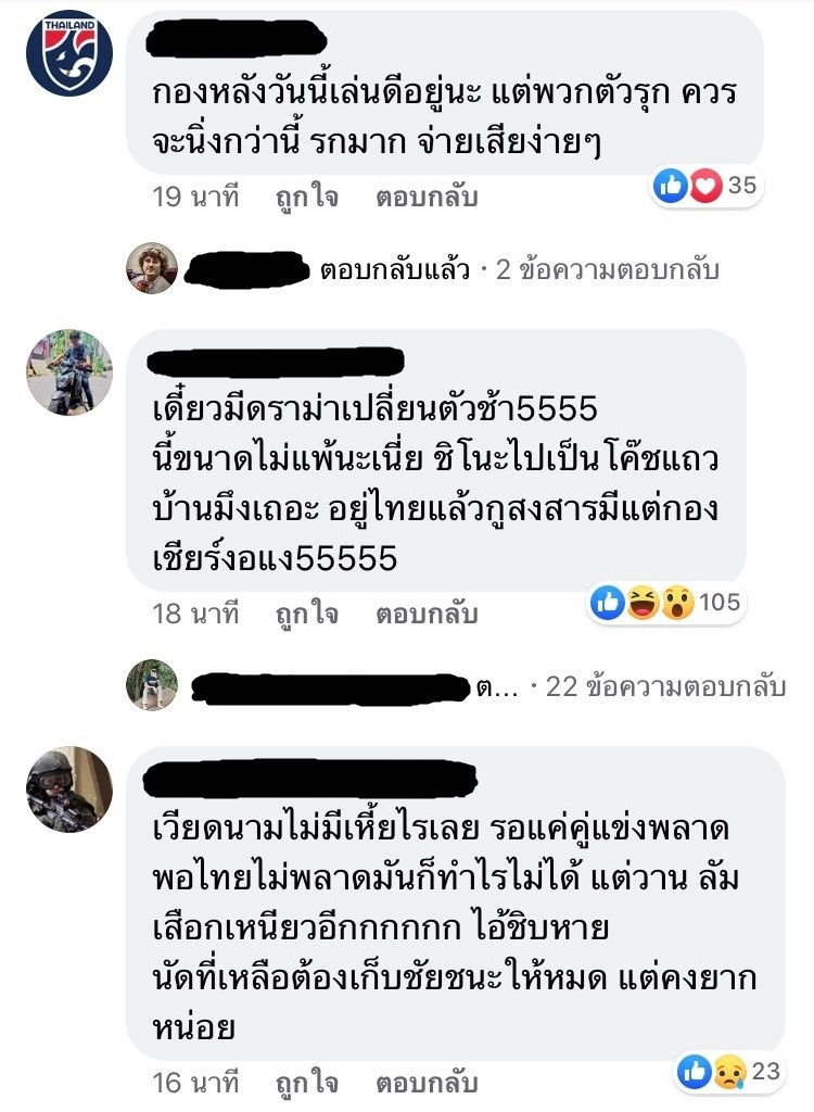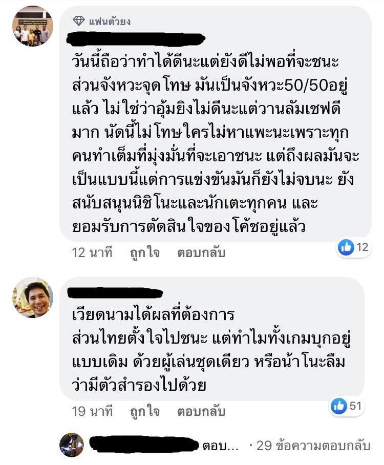 และจากสิ่งที่เกิดขึ้นในนัดนี้ ทั้งผลงานโดยรวมของทีมชาติไทย , การเปลี่ยนตัวของ อากิระ นิชิโนะ รวมถึงฟอร์มผีเข้าของ ดัง วาน ลัม… มาดูกันว่าแฟนบอลช้างศึกมีความคิดเห็นอย่างไรกันบ้าง
