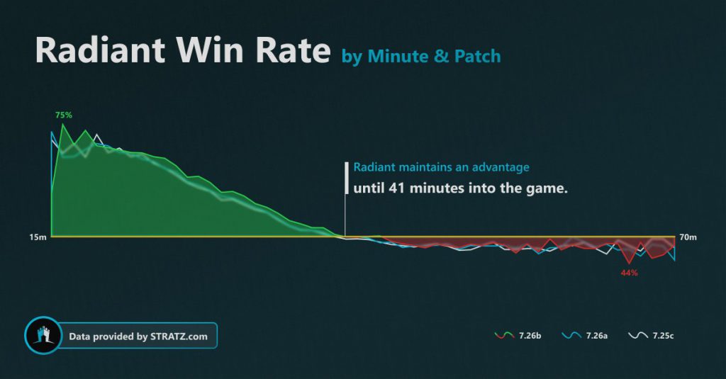 Stratz เว็บไซต์เก็บสถิติของเกม DOTA2 ชี้ว่าฝั่ง Radiant จะมีโอกาสชนะมากกว่าถึงช่วงกลางเกม ขณะที่ฝั่ง The Dire จะเริ่มมีโอกาสคว้าชัยมากกว่าตั้งแต่ช่วงเลทเกมเป็นต้นไป