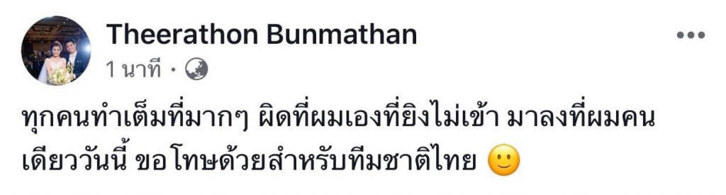 แบ็คซ้ายทีมชาติไทย ออกมาโพสต์แสดงความรับผิดชอบบนโซเชี่ยลมีเดีย หลังเจ้าตัวสังหารจุดโทษพลาด ในเกมที่ช้างศึกบุกเสมอทัพดาวทอง 0-0