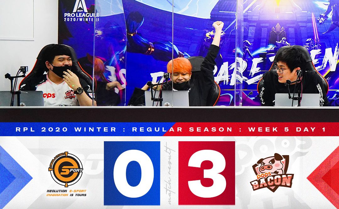 อีกคู่ นีโอลูชั่น อีสปอร์ต ทีมบ๊วยที่มี 9 คะแนน พบกับ ป๊อปส์ เบค่อน ไทมส์ ทีมอันดับ 4 ที่มี 19 คะแนน 2 เกมที่เจอกันมา เบค่อน ไทมส์ ชนะมารวดด้วยสกอร์ 3-0 และ 3-2 ส่วนไลน์อัพวันนี้ นีโอลูชั่น มีเปลี่ยนจังเกิ้ล โดย เคอร์เรจ โดนดร็อปให้ ไรเดอร์ ผู้เล่นใหม่เสียบแทน อย่างไรก็ตาม เบค่อน วันนี้มาอย่างดุไล่บุกป่าป่วนจังเกิ้ลแทบทุกเกม ก่อนเป็นฝ่ายเอาย้ำแค้นถล่มชนะไป 3-0 มีเพิ่มเป็น 22 คะแนน เหลือตามหลัง อีโวส อีสปอร์ต อยู่เพียงคะแนนเดียว