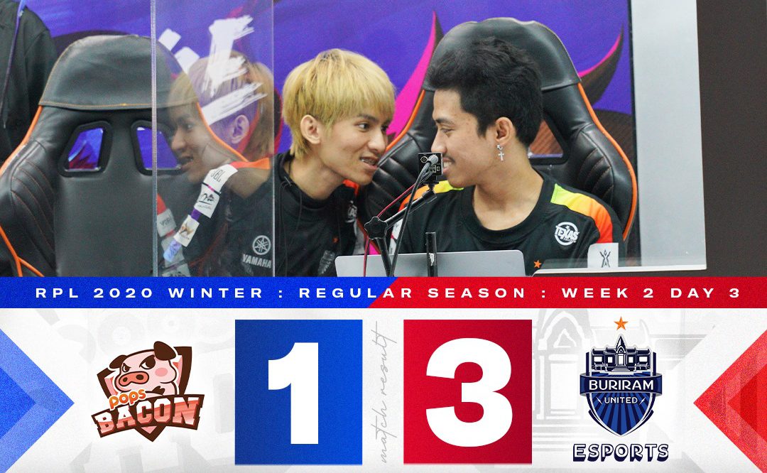 อย่างไรก็ตามเกมที่สาม บุรีรัมย์ ปรับส่ง บลูโนปิง มาเล่นป่าแทน Difoxn แถมเลือกทั้ง วีร่า และ เรียวมะ มาเล่นแต่ไม่ดีอย่างที่คิดโดน เบค่อน ไล่ถล่ม 29-5 คิลตีไข่แตกไล่มาเป็น 1-2 เกม แต่เกมที่ 4 บลูโนปิง หยิบ นาครอส มาเป็นทีเด็ดช่วยให้ทีมเอาชนะไปได้ ทำให้จบเกม บุรีรัมย์ ชนะไปได้ 3-1 เกม เก็บชัย 5 เกมติดต่อกันปิดสัปดาห์ที่สองด้วยการอยู่จ่าูฝูงเหมือนเดิม