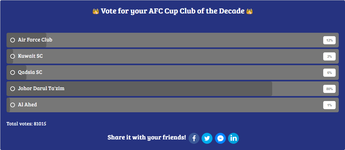 ล่าสุดได้มีการสรุปผลการโหวตออกมาเป็นที่เรียบร้อยแล้ว ซึ่งปรากฏว่า ยะโฮร์ ดารุล ทักซิม กลายเป็นทีมที่ได้รับคะแนนโหวตมากที่สุดจากแฟนบอลถึง 80% คว้าตำแหน่งสโมสรแห่งทศวรรษ ในศึก เอเอฟซี คัพ ไปครอง ส่วนอันดับที่ 2 ตกเป็นของ แอร์ ฟอร์ซ คลับ ทีมแกร่งจาก อิรัก ที่เคยคว้าแชมป์รายการนี้ได้ถึงสมัยเมื่อปี 2016 และ 2018