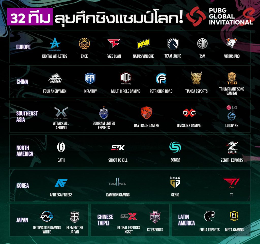 สำหรับ 32 ทีมที่จะเข้าแข่งขันในรายการ PUBG Global Invitational.S 2021 มีดังนี้