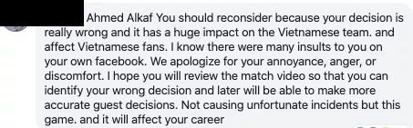 ล่าสุดมีรายงานว่า แฟนบอล เวียดนาม จำนวนมากที่ไม่พอใจคำตัดสินของ อาเหม็ด อัล-คาฟ ได้เข้าไปโพตช์ข้อความต่อว่าผู้ตัดสินรายนี้ถึงในเฟสบุ๊คส่วนตัวเลยทีเดียว