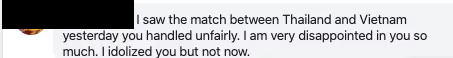 “ผมได้ดูเกมระหว่าง ไทย กับ เวียดนาม เมื่อวานนี้ ซึ่งคุณทำหน้าที่ได้ไม่ค่อยแฟร์เท่าไร ผมผิดหวังในตัวคุณมากๆ”
