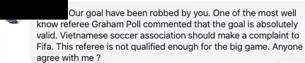 “ประตูของเราถูกคุณปล้นไป หนึ่งในผู้ตัดสินที่มีคนรู้จักมากที่สุดอย่าง เกรแฮม โพล คอมเม้นว่าลูกนี้ควรจะเป็นประตูที่สุด ทางสามาคมฟุตบอลเวียดนาม ควรต่อว่าไปยัง ฟีฟ่า นะ”