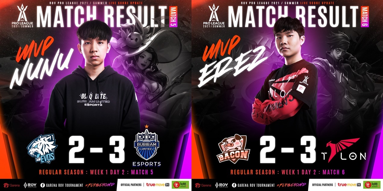![ในภาพอาจจะมี ข้อความพูดว่า "PEAGE ผลการแข่งประจำวัน 2021/SUMMER REGULAR SEASON [GLOBAL BAN-PICK BEST BESTO5] OF 5] WEEK 1 DAY2 SUN31.01.21 EA EARENA MATCH 4 eArena 2-3 KOG KING OF GAMERS CLUB EVOS EVOS ESPORTS MATCH 5 2-3 BURIRAM BRUTD BURIRAM UNITED ESPORTS ESPORTS Bac BACON TIME MATCH 6 BACON 2-3 DTLN LON DTAC TALON >ROV GARENA ROV TOURNAMENT FLYBEYOND OFFICIALPARTNERS ruemoe sun:"](https://scontent.fbkk13-1.fna.fbcdn.net/v/t1.0-9/144045171_1078431212660322_962224227145620709_o.jpg?_nc_cat=108&ccb=2&_nc_sid=730e14&_nc_eui2=AeGPHrxyQ0urNh-JWyTntlNRl5spuZ4oFheXmym5nigWF-lNrWmkbJrdtv7m-ZebdNjYPnW0RYzf2ojwbNN7AIKY&_nc_ohc=xHEenMZ0I1wAX_pzSDU&_nc_oc=AQlwGHQY_hKUXqWp8Z0wnB1c2fdPVH7TeJnvfEBYgJ2F4Fqom64jNw3YaM_FJyhAJeiCfxjACEPBsfU0pGVJZDG_&_nc_ht=scontent.fbkk13-1.fna&oh=1ddf8e47217d3f8f3d18eba98fd4906b&oe=603D596F)
