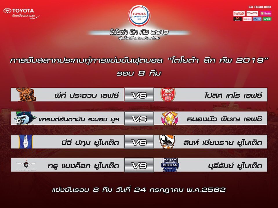โดยโปรแกรมในรอบ 8 ทีมสุดท้ายศึก โตโยต้า ลีกคัพ 2019 จะลงเล่นกันในวันที่ 24 กรกฏาคม นี้