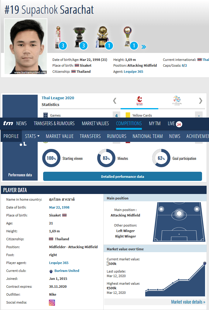 เพลย์เมกเกอร์ตังเก่งของ บุรีรัมย์ ยูไนเต็ด อย่าง สุภโชค สารชาติ ทำผลงานได้อย่างยอดเยี่ยมในศึก โตโยต้า ไทยลีก ซีซั่นนี้ รวมไปถึงเพิ่งเป็นกำลังสำคัญของทีมชาติไทย ที่ทะลุเข้าถึงรอบ 8 ทีมสุดท้าย ในศึกฟุตบอลชิงแชมป์เอเชีย รุ่นอายุไม่เกิน 23 ปี 2020 เมื่อช่วงเดือนมกราคมที่ผ่านมาด้วย